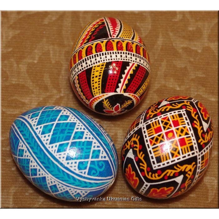 3 wonderfull Ukrainian Pysanky Easter Eggs, that have been hand blown and hand painted. These are real eggs, not wooden. Great display for Easter or Christmas time home decoration. They are hand decorated following the traditional wax and dye technique. All of them are made by the real professional and look very qualitatively.